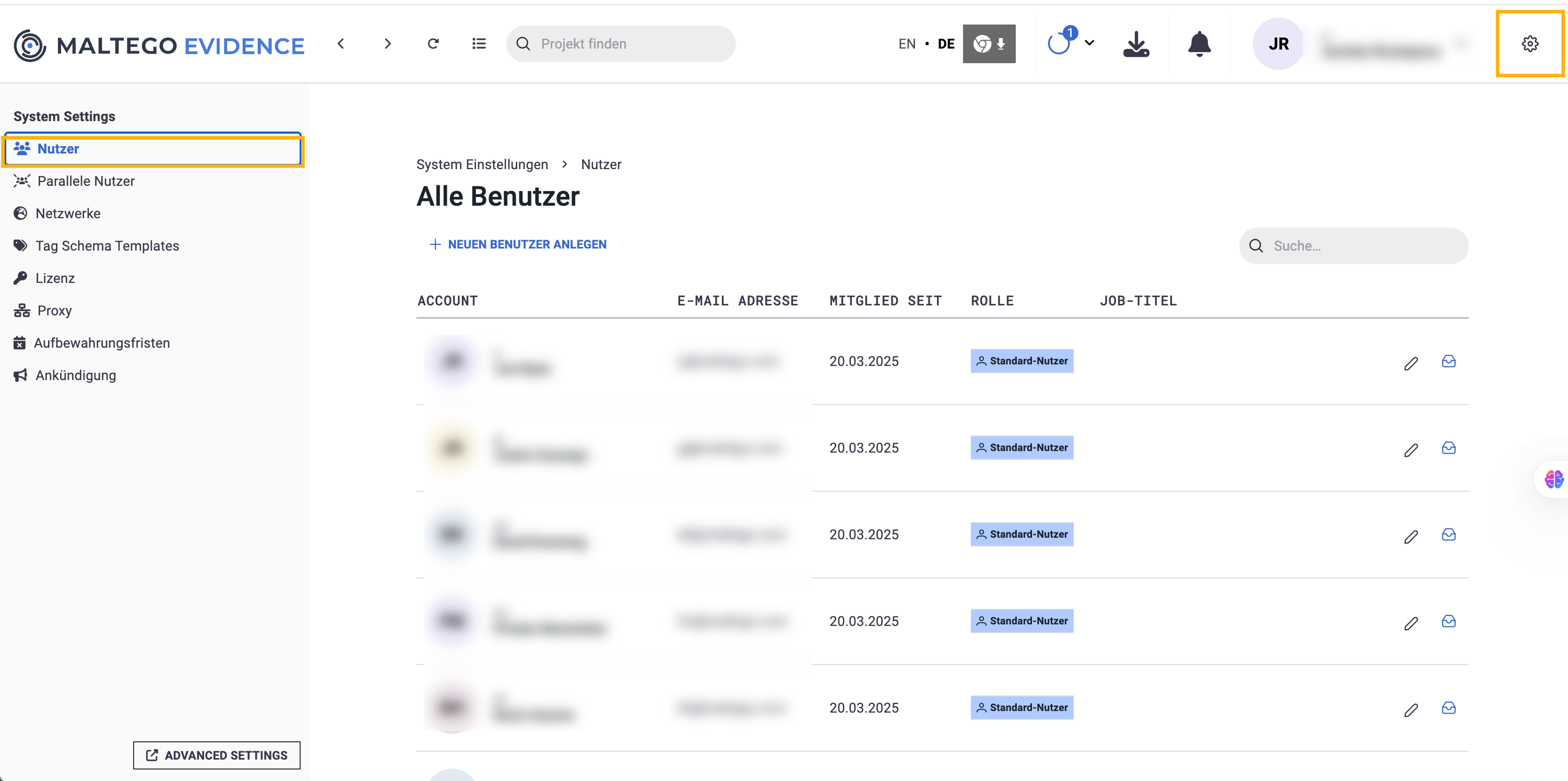 - Administrator: Der Administrator hat alle Benutzerrechte sowie vollständige Konfigurationsrechte für Maltego Evidence. Er kann alle Projekte und Inhalte sehen. Außerdem kann er Benutzer erstellen und löschen.