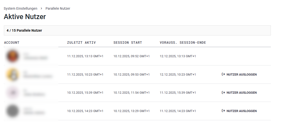 Unter dem Menüpunkt "Parallele Nutzer" können Sie für jeden Benutzer die Zeit des letzten Anmeldevorgangs (Session Start), die Zeit der letzten Aktivität (Zuletzt Aktiv) und den Zeitpunkt sehen, zu dem die Sitzung voraussichtlich automatisch endet (Vorauss. Session-Ende).