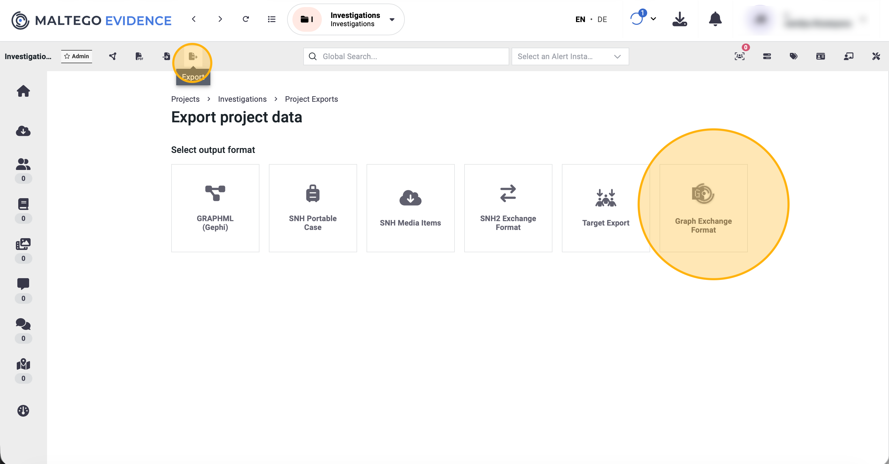 - Navigate to the Exports section in Maltego Evidence by clicking on the Export icon at the top.