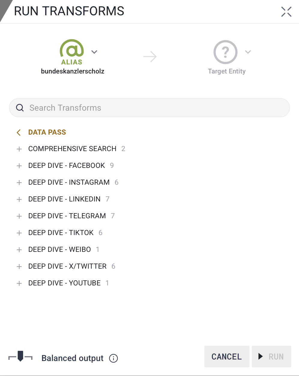 Advanced users with more precise needs can choose to expand the Composed Entity and run Transforms on Embedded Entities nested within. Available Transforms will change in this case based on the Entity type and Property rules within those Entities. For example, a user can run Transforms to get posts only from Instagram by running the appropriate Transform on the Instagram Embedded Entity instead of the Composed Entity.
